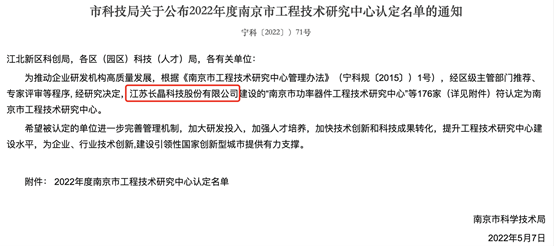 近日,南京市科学技术局发布了2022年度南京市工程技术研究中心认定名单。江苏长晶科技股份有限公司被认定为“南京市工程技术研究中心”。