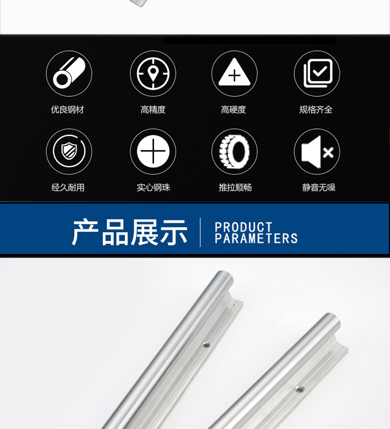 导轨材质:光轴45#高碳钢、表面镀铬、淬火硬轴 铝托导轨