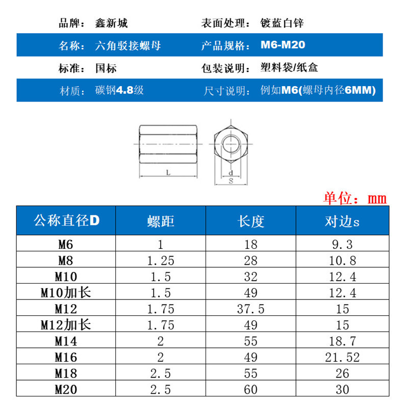 镀锌丝杆接头螺母六角加长螺母连接螺母M6M8M10M12M14 六角螺母