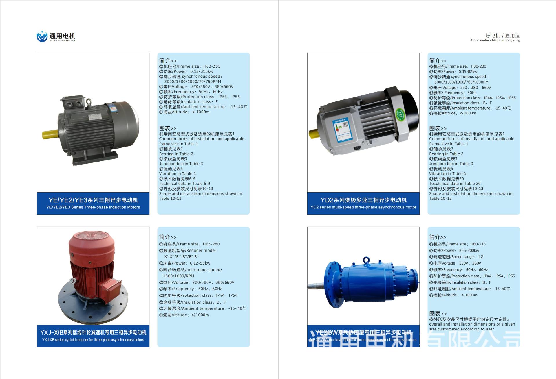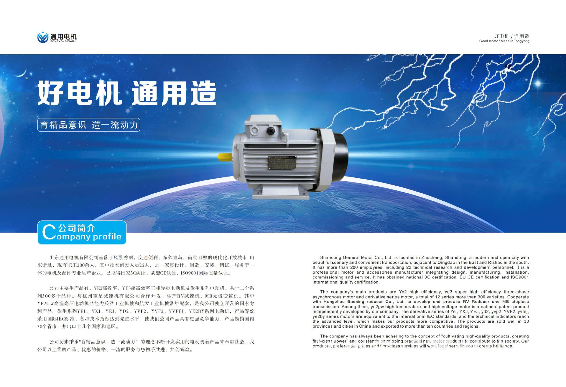 山东通用电机有限公司坐落于风景秀丽,交通便利,东邻青岛,南眦日照的现代化开放城市--山东诸城,现有职工200余人,其中技术研发人员22人,是一家集设计、制造、安装、调试、服务于一体的电机及配件生产企业。已取得国家3C认证、欧盟CE认证、ISO 9001国际质量认证。 公司主要生产品有,YE3高效率、YE4高效率三相异步电动机及派生系列电动机,共十二个系列300多个品种。与杭州宝星减速机有限公司合作开发、生产RV减速机、MB无极变速机。其中YE2GW高温高压电动机已经为兵器工业机械和航天工业机械常年配套,是我公司独立开发的产品。派生系列YEL、Y XJ、YE J、YD 3、Y VP 3、Y VF 3、Y VF EJ、YE3BY系列电动机, 产品等效采用国际IEC标准,使我们公司产品具有更强竞争能力。