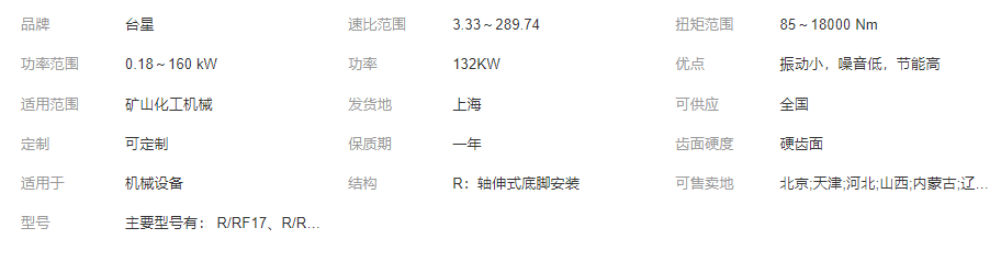 产品概述:1、本系列减速机结合国际技术要求制造,具有很高的科技含量;2、硬齿面减速机节省空间,可靠耐用,承受过载能力高,功率可达132KW;3、能耗低,性能优越,减速机效率高达95%以上;4、振动小,噪音低,节能高;5、R系列斜齿轮硬齿面减速机选用优良锻钢材料,钢性铸铁箱体,齿轮表面经过高频热处理;6、经过精细加工,确保轴平行度和定位轴承要求,形成斜齿轮传动总成的减速机配置了各种类电机,组合成机电一体化,完全保证了减速电机产品使用质量特性。性能特点:1、小偏置输出,结构紧凑,利用箱体空间,二级、三级在同一箱体内。2、采用整体式铸造箱体,箱体结构刚度好,易于提高轴的强度和轴承寿命。3、安装方式:底脚安装、法兰安装有大小法兰,易于选择。4、实心轴输出,平均效率是二级96%、三级94%、R/R 组合平均效率85%。5、专为搅拌设计的RM系列能承载较大的轴向力、径向力。技术参数:速比范围:R基本型3.33~289.74,RX型1.3~8.65,R/R组合型可达到27001扭矩范围:R基本型85~18000 Nm,RX型20~168