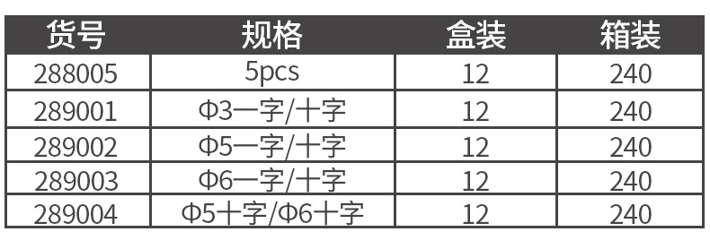 5pcs(后面4个规格刀头加上手柄),刀头直径一字3mm,十字3mm(3mm刀头+手柄),刀头直径一字5mm,十字5mm(5mm刀头+手柄),刀头直径一字6mm,十字6mm(6mm刀头+手柄),刀头直径十字5mm,十字6mm(刀头+手柄)
