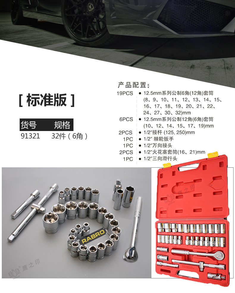 鹰之印32件12.5MM镜面套筒组套 1/2公制六角套筒扳手套装8-32MM