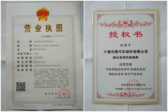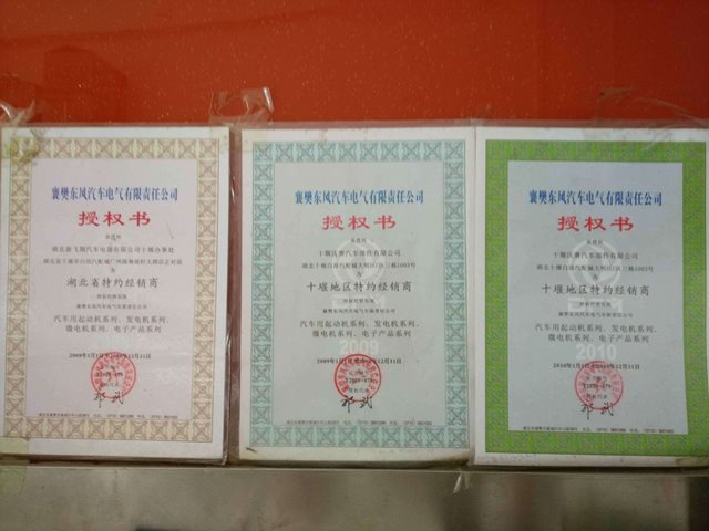 同时本公司也是襄樊东风汽车电气有限公司的十堰地区特约经销商,特约经销商编号:T2008-079,常年存有大批现货以备东风汽车售后调件!