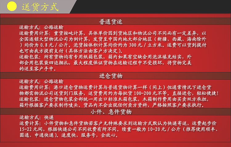 物流:客户在买下大批量产品时,请客户用普通物流运输,这样以节约成本,具体可以QQ或者电话详谈。