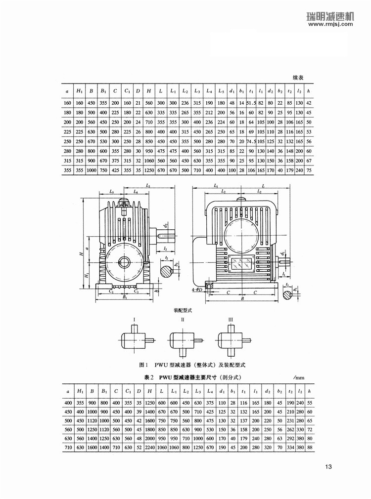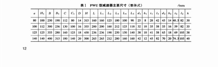 (1)整体式PWU型减速器主要尺寸见图1和表1。