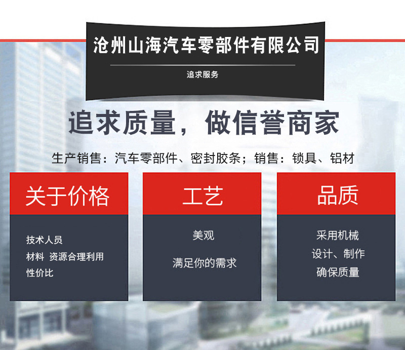 沧州山海汽车零部件有限公司是三元乙丙密封条、橡塑密封条、冷藏箱不锈钢锁具、集装箱锁具、骑马螺丝、弓卡子、海运集装箱配件、紧绳器、马槽沟、车厢铝材等产品生产加工的公司,有完整、科学的质量管理体系。沧州山海汽车零部件有限公司的诚信、实力和产品质量获得业界的好评。欢迎各界朋友莅临参观、指导和业务洽谈。