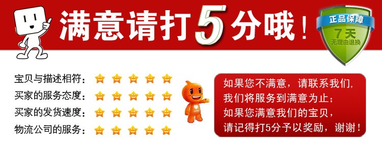 6、我们重视每位顾客中差评,收到货如果满意请及时确认付款好评!若出现问题请与本店客服人员取得联系,本店定会竭尽所能解决您的问题!不经联系贸然作出的中差评,不但不能解决任何问题,对您自己也是种不负责任的做法且导致对我们的不公!网上交易,希望将心比心,理解配合,谢谢!