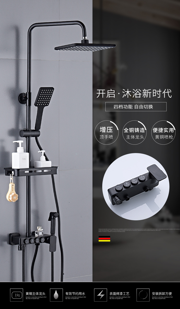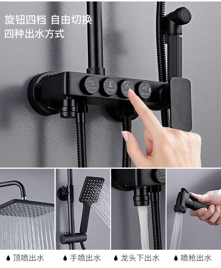 规格黑色按键四挡花洒A款,黑色按键四挡花洒B款,黑色按键四挡花洒C款,黑色按键三挡花洒A款,黑色按键三挡花洒B款,黑色按键三挡花洒C款,黑色按键四挡恒温花洒A款,黑色按键三挡恒温花洒B款,黑色按键三挡恒温花洒C款,黑色苹果小三档花洒套装