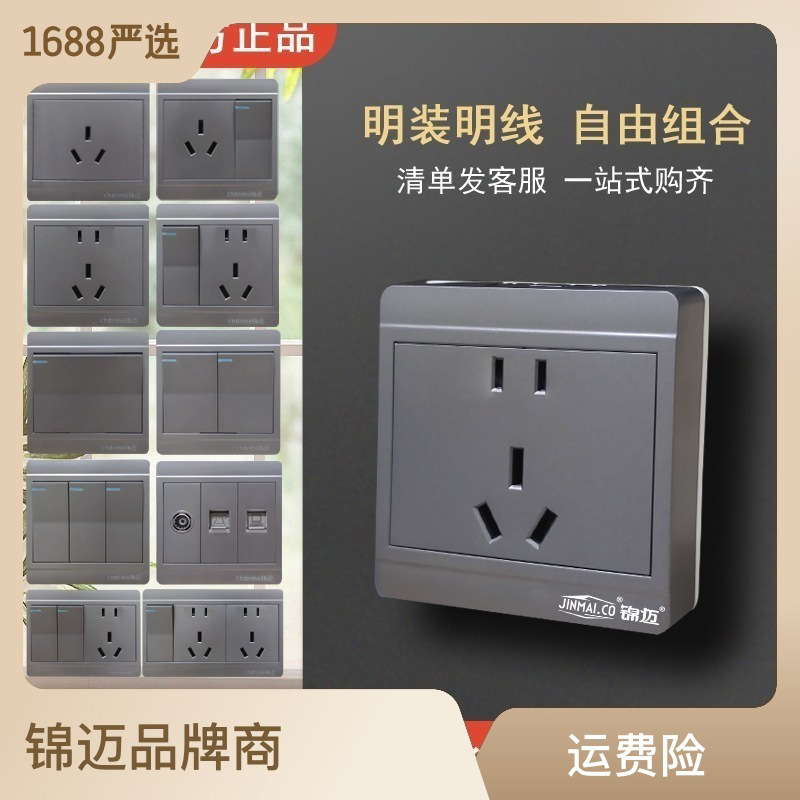 锦迈灰色明装墙壁插座开关1-10开三五七十四五二十五孔面板明线盒