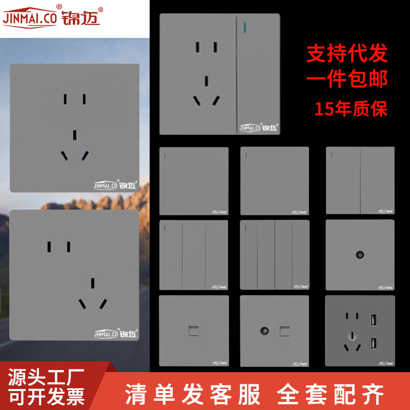 锦迈86型墙壁插座批发16A一开双控五孔暗装家用开关插座面板灰色