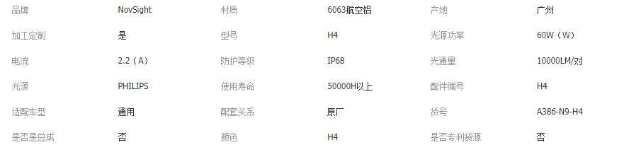 LED光源:PHILIPS 功率:60W /对 流明:10000LM /对 色温:6500K白 电压:DC 12-24V 电流:2.2A±0.15A 工作温度:-40℃~+ 90℃ 光束角度:360° 防水等级:IP68 寿命:≥50,000小时 证书:CE,Rohs 材质:6063航空铝 用途:汽车前大灯