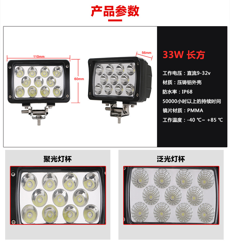 工厂直销 33wLED工作灯 越野led照明灯 货车灯 超亮射灯聚光泛光