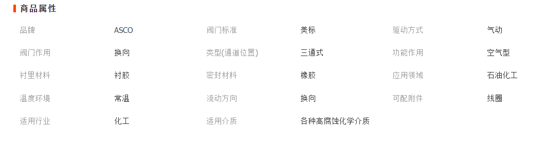 ASCO电磁阀、气控阀系列产品在市场应用广泛,经过一世纪,ASCO已成为流体控制应用系统的主要选择。公司生产超过3000多种标准电磁阀和20000多个非标准型号。产品按照严格的生产规定,在工、商业界应用非常广泛。主要包括:控制空气、水、轻油、惰性气体、燃油、汽油、蒸汽、真空、超低温、高频率操作、液化气、除尘、自动出售机、腐蚀性介质等。