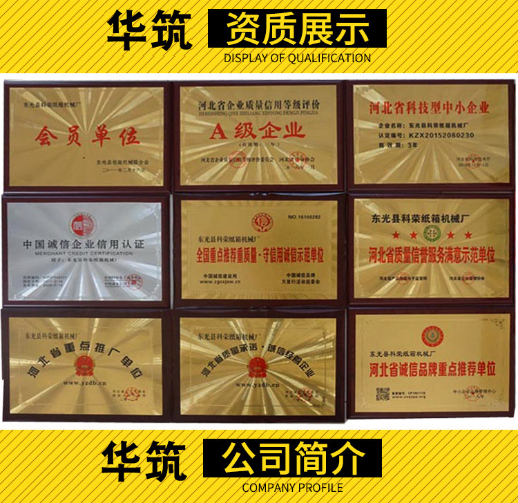 我公司前身为东光县科荣纸箱机械厂,自1992年成立以来,不断扩展企业规模,立足现在放眼未来,内强管理外拓市场,自2010年开拓了国外市场,设备已远销印度、越南、柬埔寨、韩国、印度尼西亚、以及部分欧洲国家,我公司2018年新注册公司名为河北华筑纸箱设备制造有限公司,进一步扩大了企业规模,同时也加大了科研力度,研制出多种新产品类型,获得“河北省科技型企业”等10多项企业荣誉,力求以物美价廉的产品和完备周到的售后服务真正做到让客户买的放心,用的舒心,实现双赢多赢,董事长李树军欢迎社会各界人事莅临指导,共创实体经济发展新台阶