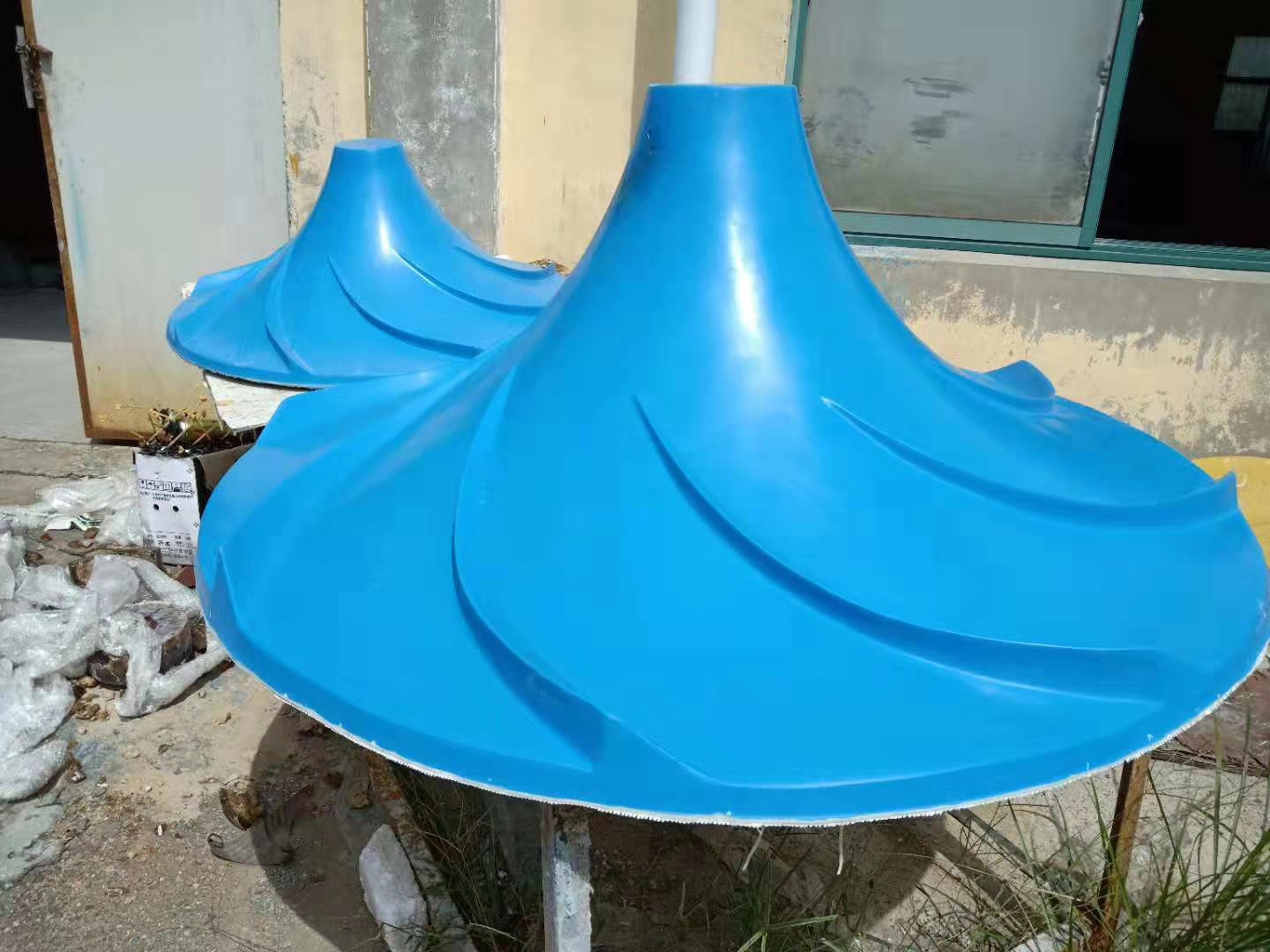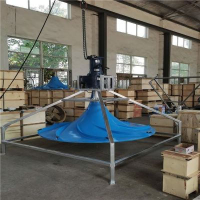 双曲面搅拌机可以创建大容量水流的搅拌装置,并能以较小的动力获得大面积循环、柔和的水流。双曲面搅拌机的叶轮结构设计,大限度的将流体特性与机械运动相结合。多曲叶轮的曲面是方程为xy=b,曲线沿y轴旋转而构成的曲面体;为了迎合水体流动,设计从叶轮的中心进水,这一方面减少了进水紊流,另一方面保证了液体对叶轮表面的压力均匀,从而保证整机在运动状态下的平衡。在渐开多弧面上均匀有八条导游叶片,借助液体自重压力作补充进水获得的势能与叶轮旋转时产生的离心力形成动能,液体在中立加速度的条件先沿叶轮圆周方向做切线运动,在池壁的反射作用下,形成自上而下地循环水流,故可获得在轴向(y)和径向(x)方向的交叉水流。正是由于多曲面搅拌机叶轮的结构和特性和接近池底安装的特点,决定在工作中可获得理想的搅拌效果,能有效的消除搅拌边角。