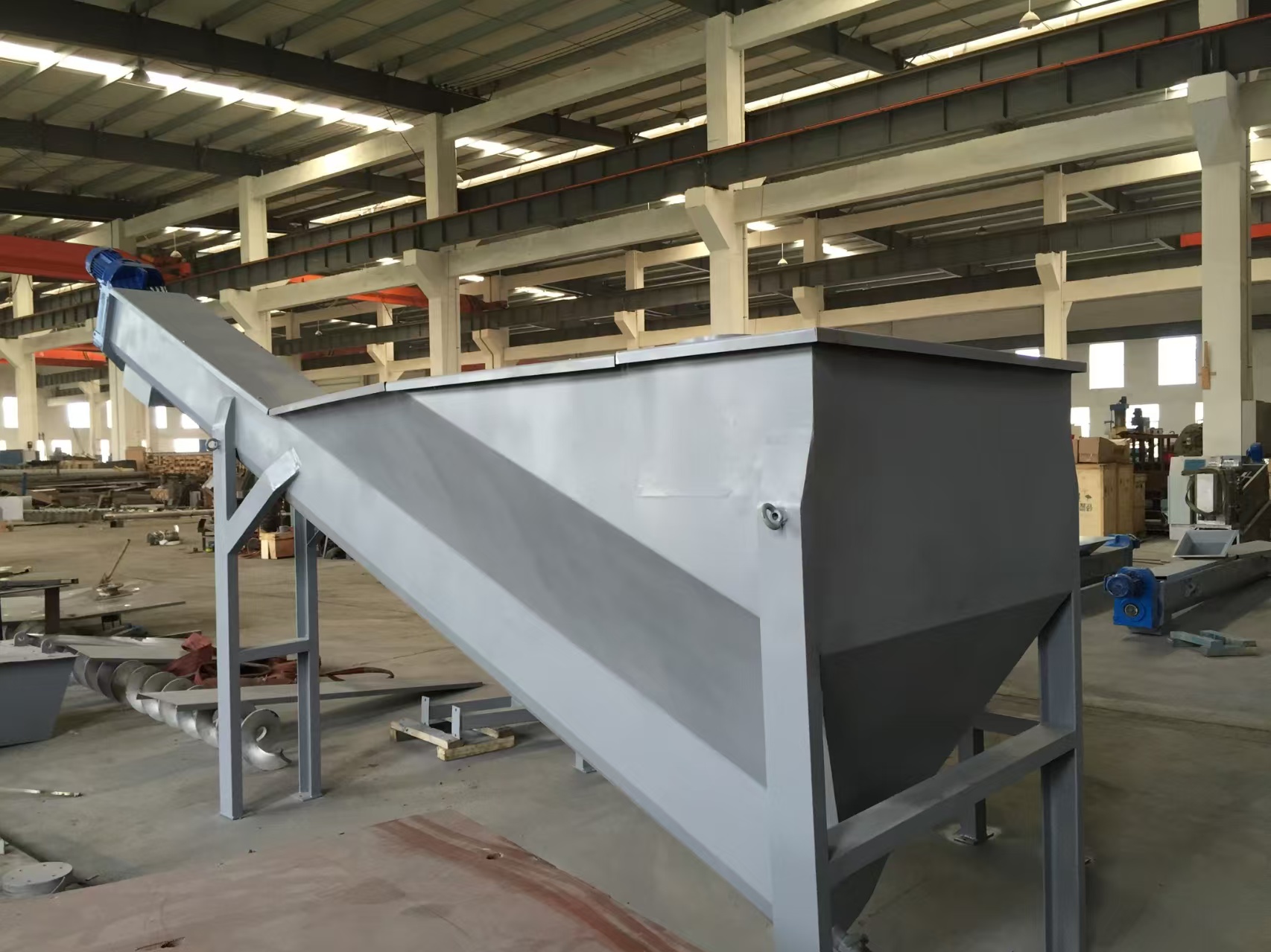 螺旋式砂水分离机主要由无轴螺旋体、U型螺旋输送槽、驱动装置、耐磨衬里、贮水箱等部件组成。