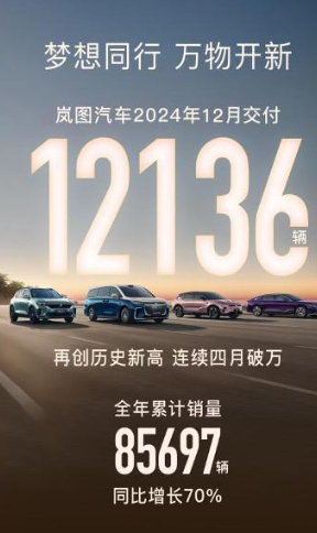 回顾 2024 年,1 - 12 月岚图汽车累计销量达到 85697 辆,同比大幅增长 70%,产品市场均价稳定保持在 35 万元以上。在众多硬核科技创新的强力赋能下,岚图汽车实现了口碑与销量的双丰收,展现出势不可挡的强劲发展势头。