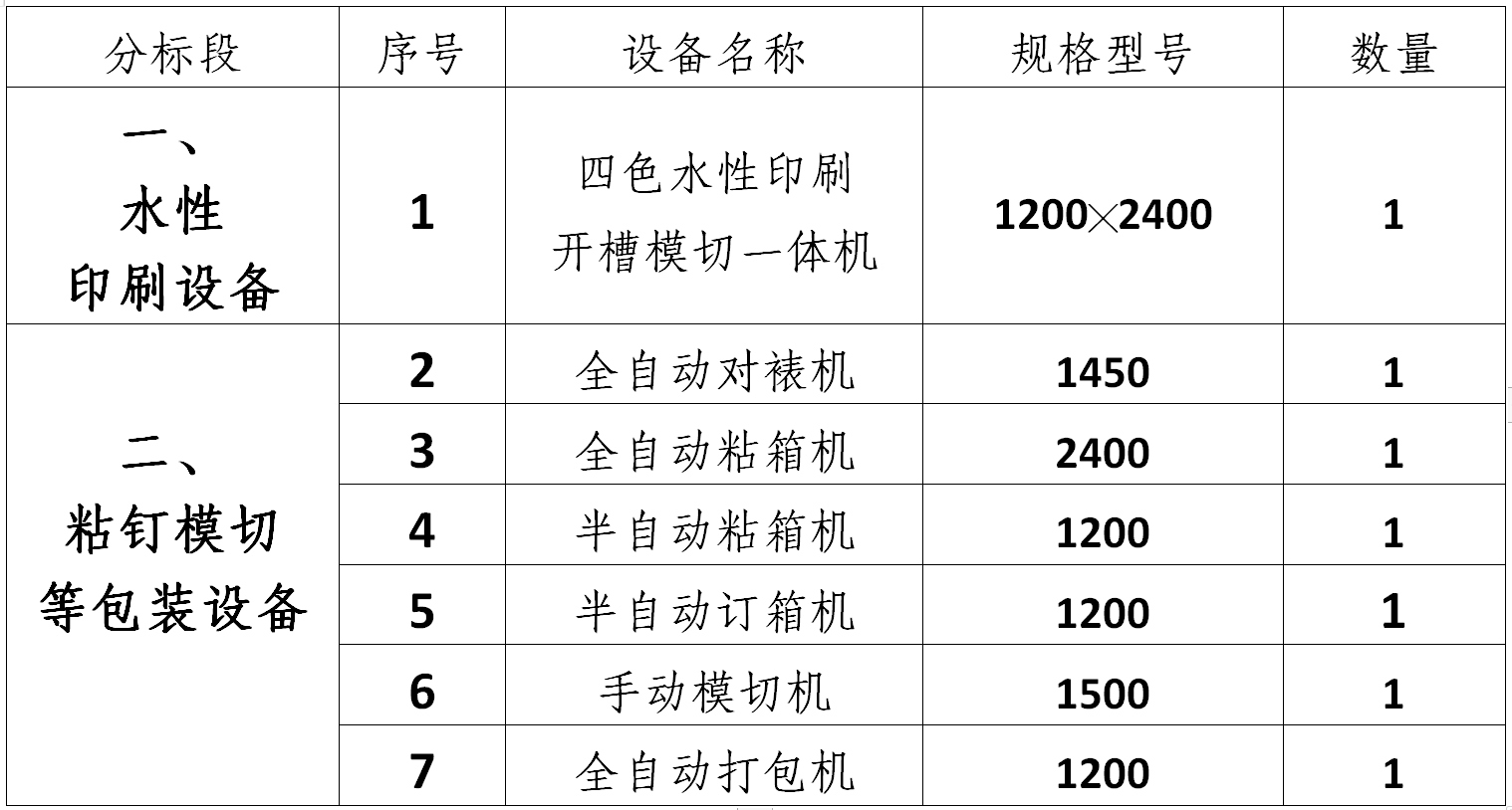 3、本招标项目共有两个分标段:(1)水性印刷设备;(2)粘钉模切等包装设备。投标人只能对其中的一个分标段进行投标。