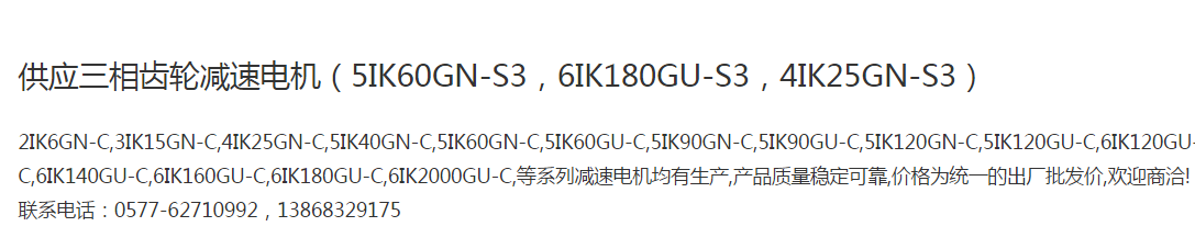 本网页所展示的有关【供应三相齿轮减速电机(5IK60GN-S3,6IK180GU-S3,4IK25GN-S3)_其他配件_温州东力电机有限公司】的信息/图片/参数等由全球零部件网的会员【温州东力电机有限公司】提供,由全球零部件网会员【温州东力电机有限公司】自行对信息/图片/参数等的真实性、准确性和合法性负责,本平台(本网站)仅提供展示服务,请谨慎交易,因交易而产生的法律关系及法律纠纷由您自行协商解决,本平台(本网站)对此不承担任何责任。您在本网页可以浏览【供应三相齿轮减速电机(5IK60GN-S3,6IK180GU-S3,4IK25GN-S3)_其他配件_温州东力电机有限公司】有关的信息/图片/价格等及提供【供应三相齿轮减速电机(5IK60GN-S3,6IK180GU-S3,4IK25GN-S3)_其他配件_温州东力电机有限公司】的商家公司简介、江南(中国)等信息。