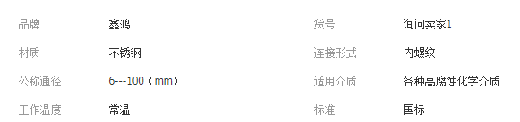 本网页所展示的有关【厂家直销内螺纹不锈钢球阀 丝扣球阀Q11F-16P 手动一片式球阀_球阀_浙江鑫鸿阀门管件有限公司】的信息/图片/参数等由全球零部件网的会员【浙江鑫鸿阀门管件有限公司】提供,由全球零部件网会员【浙江鑫鸿阀门管件有限公司】自行对信息/图片/参数等的真实性、准确性和合法性负责,本平台(本网站)仅提供展示服务,请谨慎交易,因交易而产生的法律关系及法律纠纷由您自行协商解决,本平台(本网站)对此不承担任何责任。您在本网页可以浏览【厂家直销内螺纹不锈钢球阀 丝扣球阀Q11F-16P 手动一片式球阀_球阀_浙江鑫鸿阀门管件有限公司】有关的信息/图片/价格等及提供【厂家直销内螺纹不锈钢球阀 丝扣球阀Q11F-16P 手动一片式球阀_球阀_浙江鑫鸿阀门管件有限公司】的商家公司简介、江南(中国)等信息。