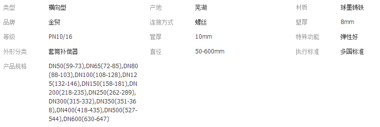 本网页所展示的有关【厂家供应管道给水管伸缩节波纹自动伸缩器法兰套筒伸缩器补偿器_管件_芜湖市金贸流体科技股份有限公司】的信息/图片/参数等由全球零部件网的会员【芜湖市金贸流体科技股份有限公司】提供,由全球零部件网会员【芜湖市金贸流体科技股份有限公司】自行对信息/图片/参数等的真实性、准确性和合法性负责,本平台(本网站)仅提供展示服务,请谨慎交易,因交易而产生的法律关系及法律纠纷由您自行协商解决,本平台(本网站)对此不承担任何责任。您在本网页可以浏览【厂家供应管道给水管伸缩节波纹自动伸缩器法兰套筒伸缩器补偿器_管件_芜湖市金贸流体科技股份有限公司】有关的信息/图片/价格等及提供【厂家供应管道给水管伸缩节波纹自动伸缩器法兰套筒伸缩器补偿器_管件_芜湖市金贸流体科技股份有限公司】的商家公司简介、江南(中国)等信息。