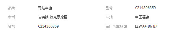 本网页所展示的有关【048-前制动盘 奥迪A4/B6/B7前刹车碟 汽车配件厂家批发直销_刹车/制动电阻_福建省元达丰通汽车配件贸易有限公司】的信息/图片/参数等由全球零部件网的会员【福建省元达丰通汽车配件贸易有限公司】提供,由全球零部件网会员【福建省元达丰通汽车配件贸易有限公司】自行对信息/图片/参数等的真实性、准确性和合法性负责,本平台(本网站)仅提供展示服务,请谨慎交易,因交易而产生的法律关系及法律纠纷由您自行协商解决,本平台(本网站)对此不承担任何责任。您在本网页可以浏览【048-前制动盘 奥迪A4/B6/B7前刹车碟 汽车配件厂家批发直销_刹车/制动电阻_福建省元达丰通汽车配件贸易有限公司】有关的信息/图片/价格等及提供【048-前制动盘 奥迪A4/B6/B7前刹车碟 汽车配件厂家批发直销_刹车/制动电阻_福建省元达丰通汽车配件贸易有限公司】的商家公司简介、江南(中国)等信息。
