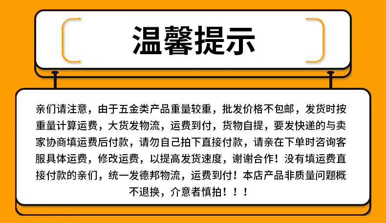 亲们请注意,由于五金类产品重量较重,批发价格不包邮,发货时按重量计算运费,大货发物流,运费到付,货物自提,要发快递的与卖家协商填运费后付款,请勿自己拍下直接付款,请亲在下单时咨询客服具体运费,修改运费,以提高发货速度,谢谢合作,给您带来不便,请见谅,谢谢!!!没有填运费直接付款的亲们,统一发德邦物流,运费到付!!!