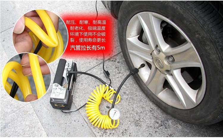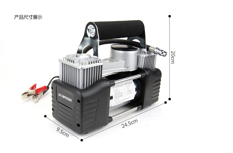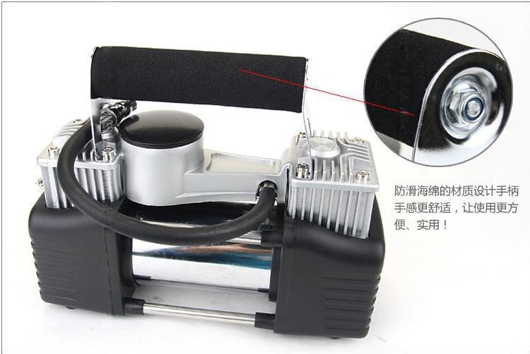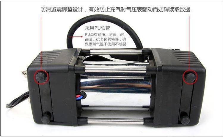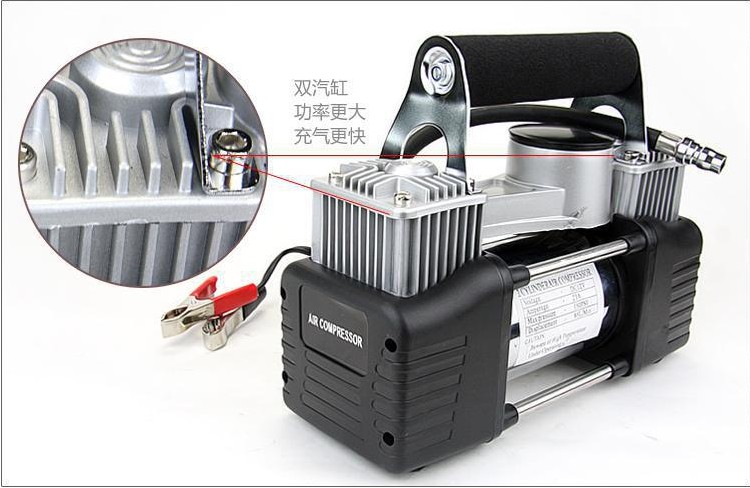 注意:双缸充气泵是采用汽车电瓶供电,不能插点烟器,双缸功率大,打气快!不要嫌麻烦,毕竟这是应急的工具,没气的几率并不大,稍微麻烦那一回是可以忽略不计的!