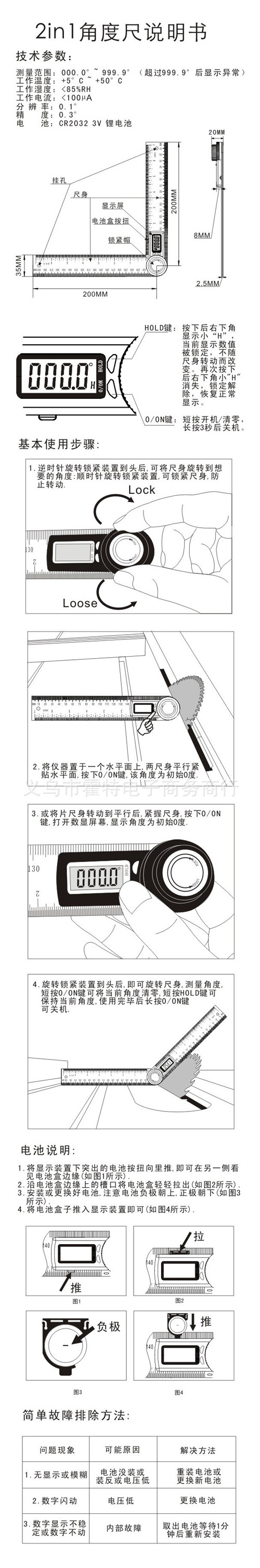 商品名称:数显角度尺 商品规格:0-200MM/0-300MM/0-500MM 商品材质:不锈钢 商品表面处理:镀烙 商品刻度工艺:激光刻度 商品精度:0.01 应用领域
