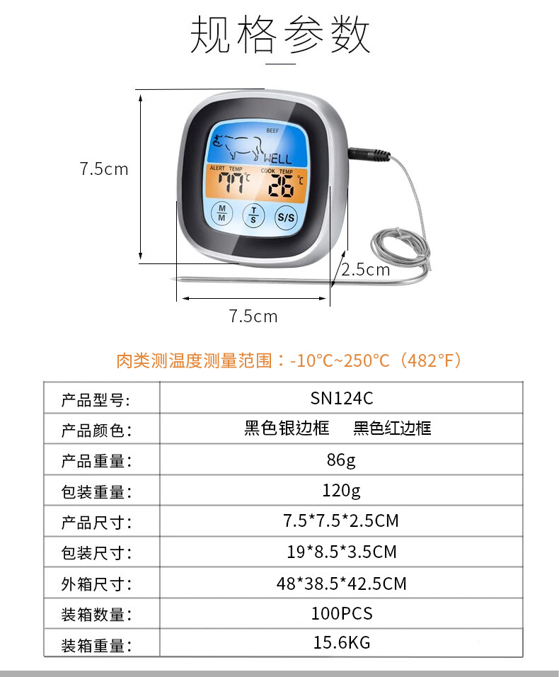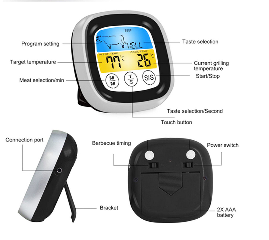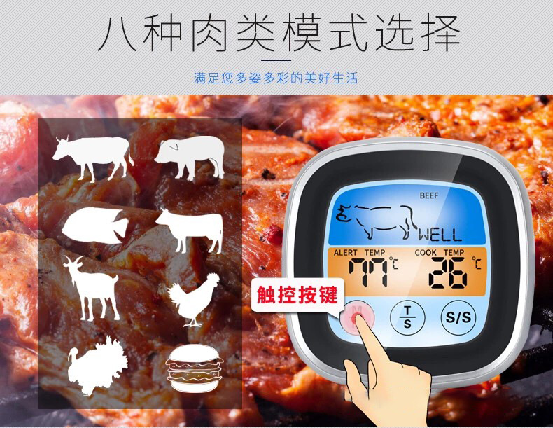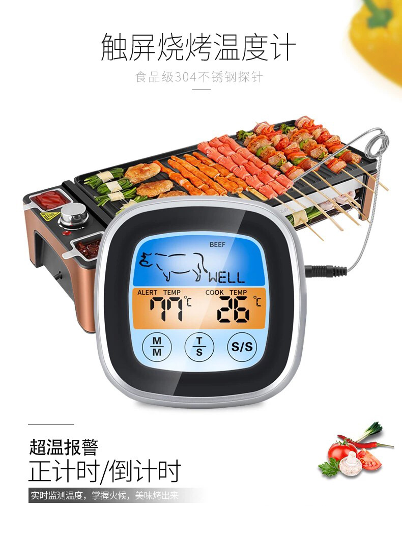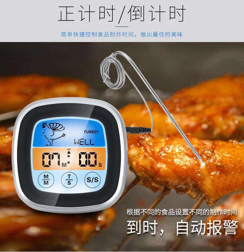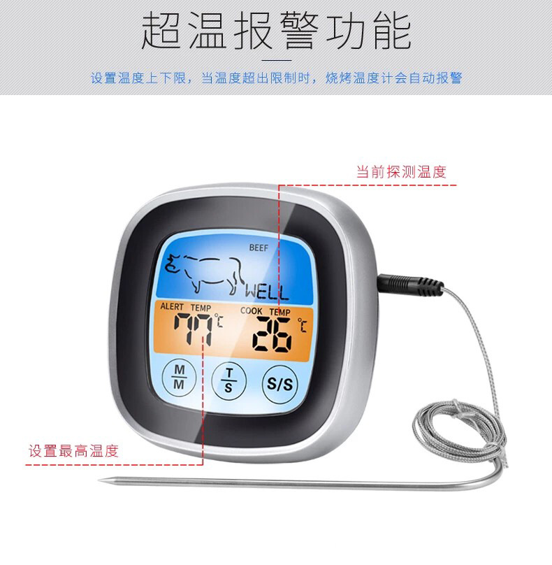 触摸屏电子温度计 计时器烧烤温度计 厨房彩屏食品温度计家用报警