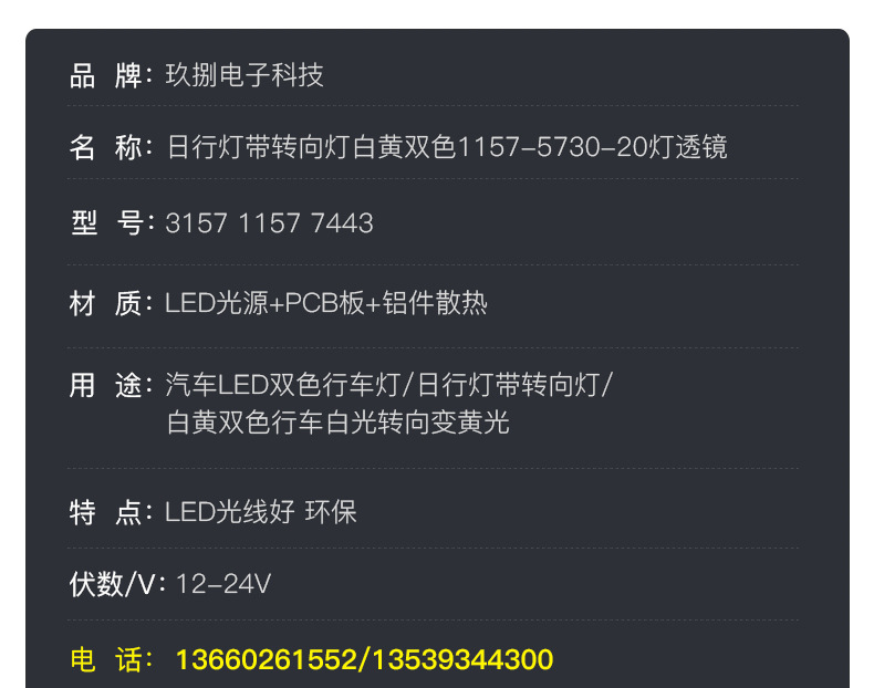 本网页所展示的有关【3157 5730 20smd 行车灯 转向灯 日行灯 7443车灯 1157车灯_汽车灯具_佛山市玖捌电子科技有限公司】的信息/图片/参数等由全球零部件网的会员【佛山市玖捌电子科技有限公司】提供,由全球零部件网会员【佛山市玖捌电子科技有限公司】自行对信息/图片/参数等的真实性、准确性和合法性负责,本平台(本网站)仅提供展示服务,请谨慎交易,因交易而产生的法律关系及法律纠纷由您自行协商解决,本平台(本网站)对此不承担任何责任。您在本网页可以浏览【3157 5730 20smd 行车灯 转向灯 日行灯 7443车灯 1157车灯_汽车灯具_佛山市玖捌电子科技有限公司】有关的信息/图片/价格等及提供【3157 5730 20smd 行车灯 转向灯 日行灯 7443车灯 1157车灯_汽车灯具_佛山市玖捌电子科技有限公司】的商家公司简介、江南(中国)等信息。
