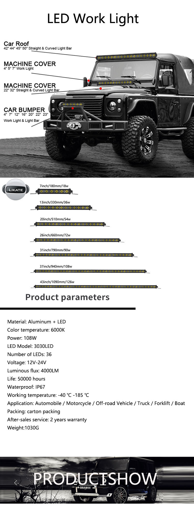 本网页所展示的有关【厂家直销新款汽车led工作灯 单排108w36smd长条越野车顶检修射灯_汽车灯具_广州利卡特电子科技有限公司】的信息/图片/参数等由全球零部件网的会员【广州利卡特电子科技有限公司】提供,由全球零部件网会员【广州利卡特电子科技有限公司】自行对信息/图片/参数等的真实性、准确性和合法性负责,本平台(本网站)仅提供展示服务,请谨慎交易,因交易而产生的法律关系及法律纠纷由您自行协商解决,本平台(本网站)对此不承担任何责任。您在本网页可以浏览【厂家直销新款汽车led工作灯 单排108w36smd长条越野车顶检修射灯_汽车灯具_广州利卡特电子科技有限公司】有关的信息/图片/价格等及提供【厂家直销新款汽车led工作灯 单排108w36smd长条越野车顶检修射灯_汽车灯具_广州利卡特电子科技有限公司】的商家公司简介、江南(中国)等信息。