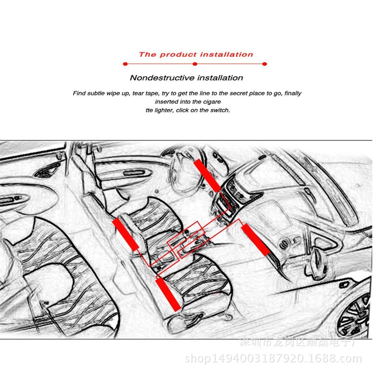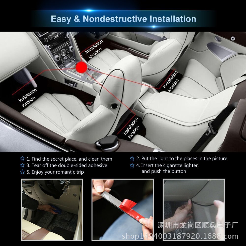 安装:将四个灯分别用双面胶固定,将点烟器接口插入车上点烟器接口,按下开关即可,操作非常简单