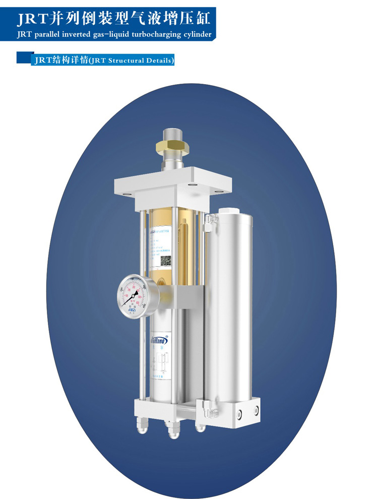 JRT并列倒装型气液增压缸并列式结构,纵向长度短,宽度稍宽,储油桶和油气结合缸紧靠,在安装空间受纵向长度限制的场合及预压行程长的场合得到广泛应用。
