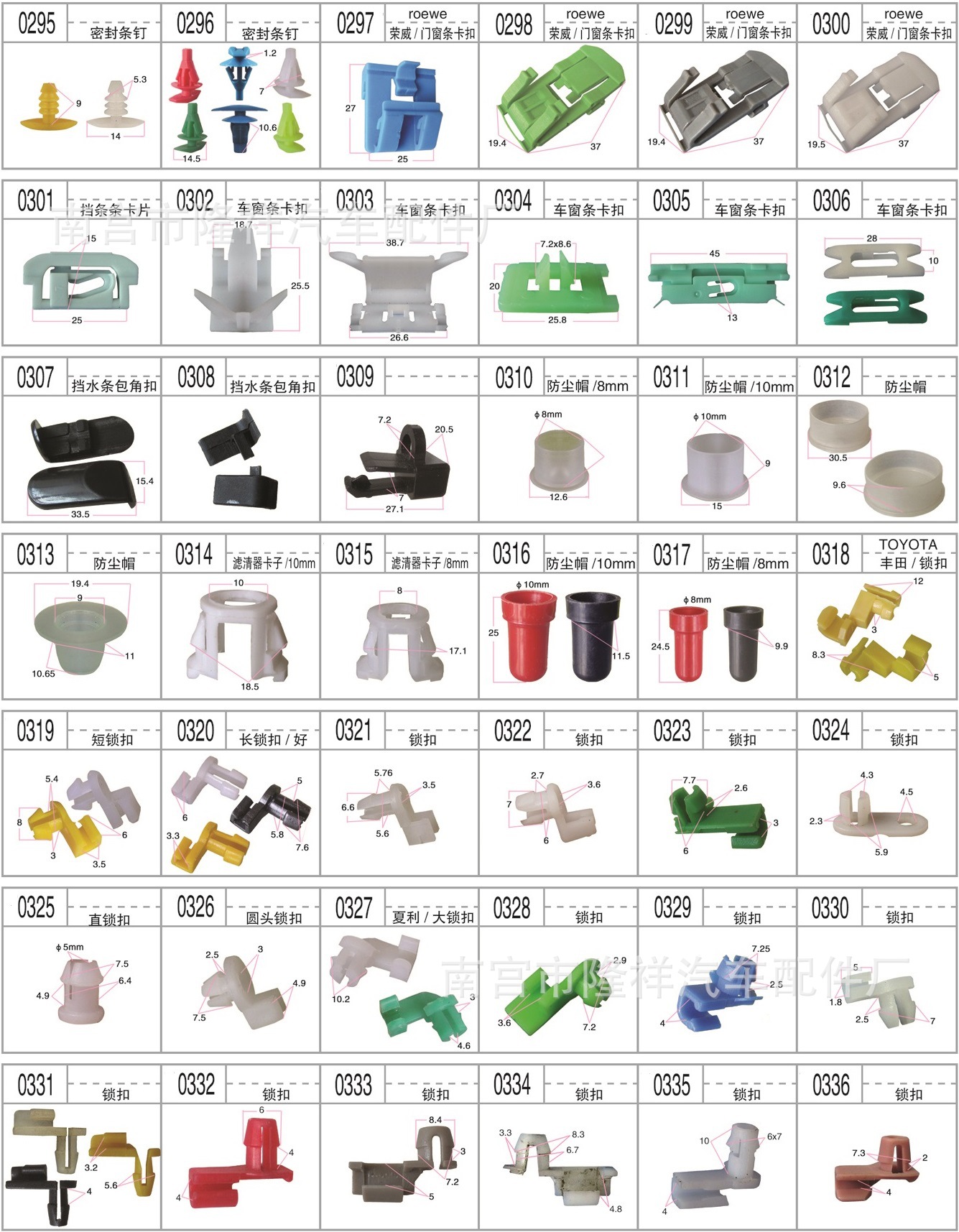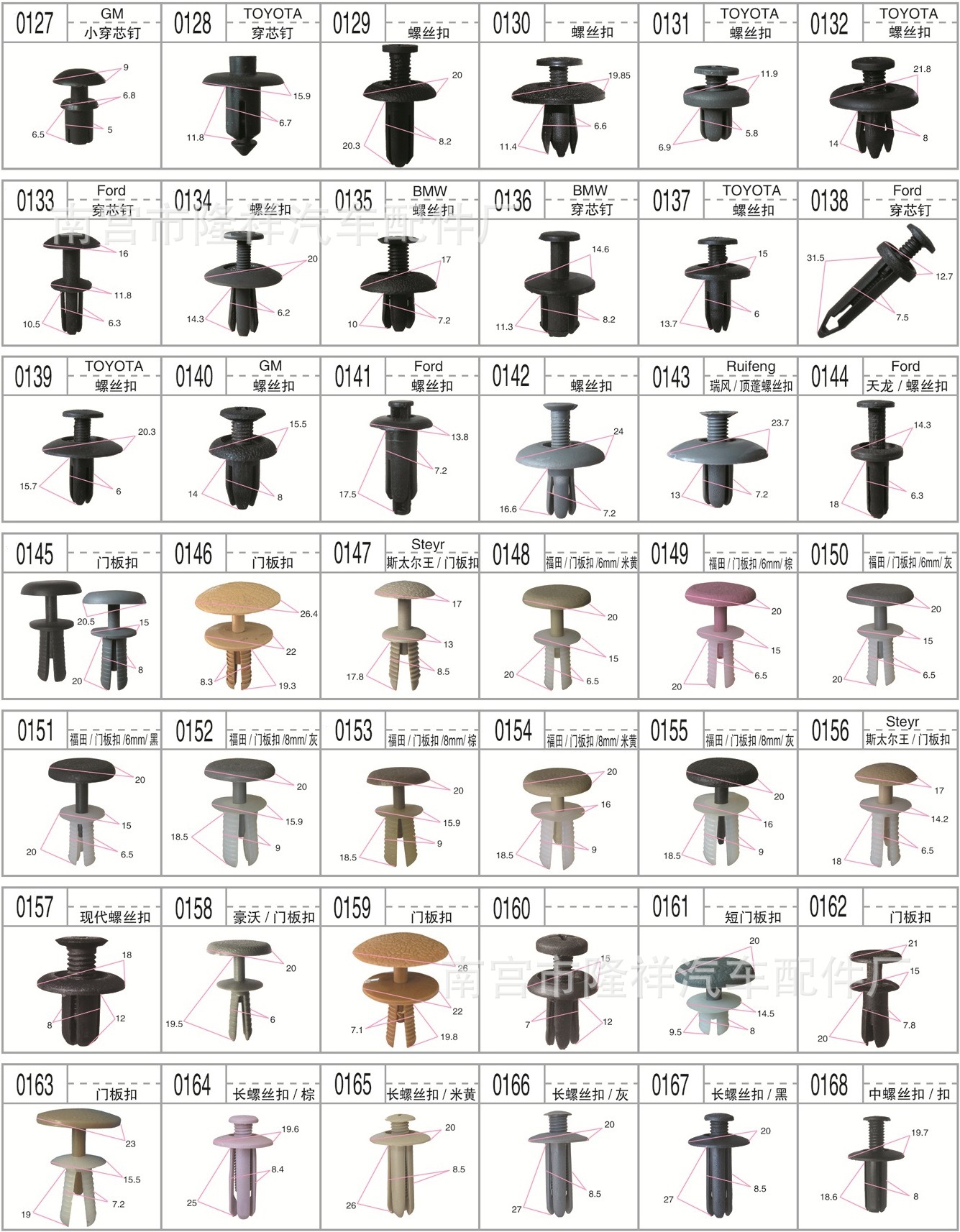 门板卡扣系列 顶蓬卡扣系列 膨胀螺丝系列 封皮卡扣系列 穿芯钉系列 密封条钉系列 线/管束固定夹 隔热棉卡扣 玻璃托卡扣 支撑…