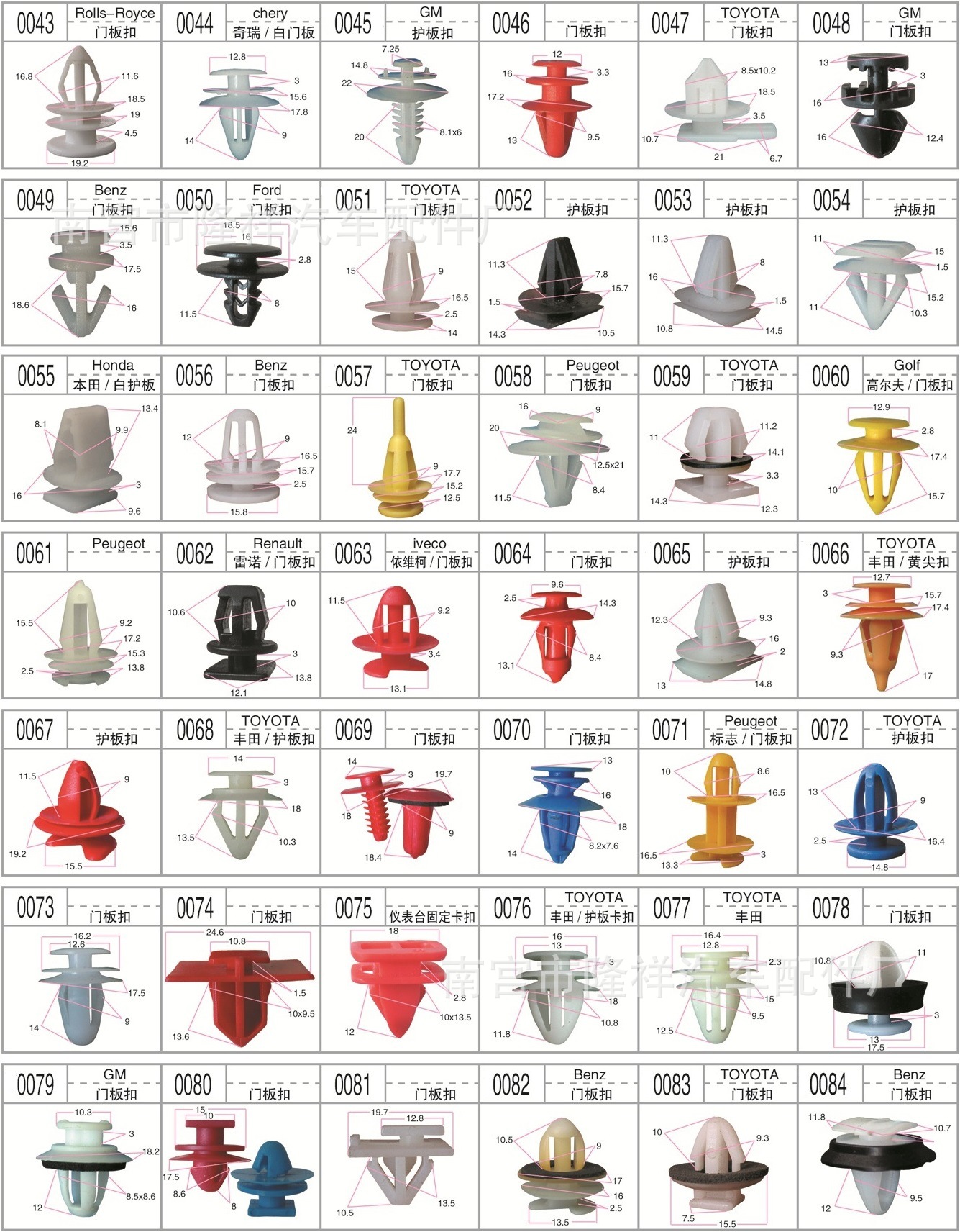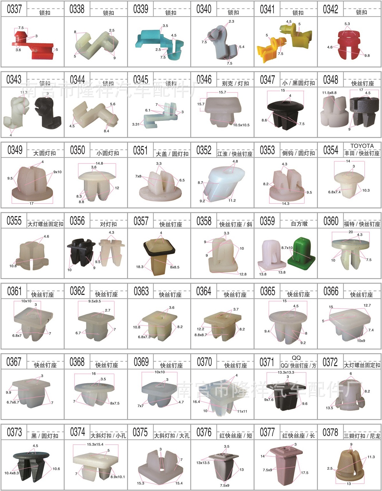 门板卡扣系列 顶蓬卡扣系列 膨胀螺丝系列 封皮卡扣系列 穿芯钉系列 密封条钉系列 线/管束固定夹 隔热棉卡扣 玻璃托卡扣 支撑…