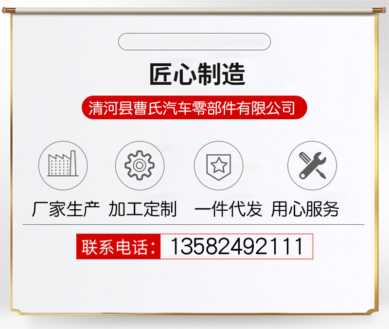清河县曹氏汽车零部件有限公司是汽车配件等产品生产加工的公司,有完整、科学的质量管理体系。清河县曹氏汽车零部件有限公司的诚信、实力和产品质量获得业界的认同。欢迎各界朋友莅临参观、指导和业务洽谈。