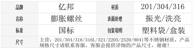 本网页所展示的有关【201/304/316不锈钢膨胀螺栓 膨胀螺丝 拉爆螺丝 膨胀螺丝M6-M16_螺栓_兴化市亿邦金属制品有限公司】的信息/图片/参数等由全球零部件网的会员【兴化市亿邦金属制品有限公司】提供,由全球零部件网会员【兴化市亿邦金属制品有限公司】自行对信息/图片/参数等的真实性、准确性和合法性负责,本平台(本网站)仅提供展示服务,请谨慎交易,因交易而产生的法律关系及法律纠纷由您自行协商解决,本平台(本网站)对此不承担任何责任。您在本网页可以浏览【201/304/316不锈钢膨胀螺栓 膨胀螺丝 拉爆螺丝 膨胀螺丝M6-M16_螺栓_兴化市亿邦金属制品有限公司】有关的信息/图片/价格等及提供【201/304/316不锈钢膨胀螺栓 膨胀螺丝 拉爆螺丝 膨胀螺丝M6-M16_螺栓_兴化市亿邦金属制品有限公司】的商家公司简介、江南(中国)等信息。