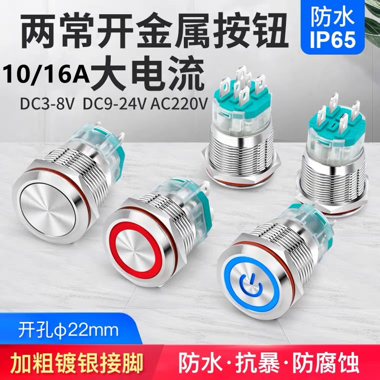大电流金属按钮22mm带灯启动电源10A15A自复位自锁开关12-220V