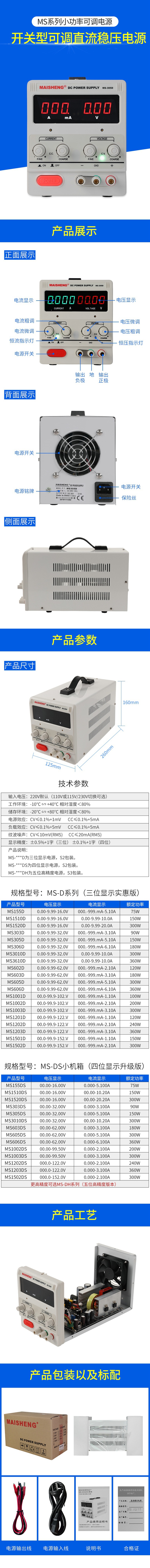 型号MS155D(15V5A三位数显),MS155DS(15V5A四位数显),MS1510DS(15V10A四位数显),MS1520DS(15V20A四位数显)