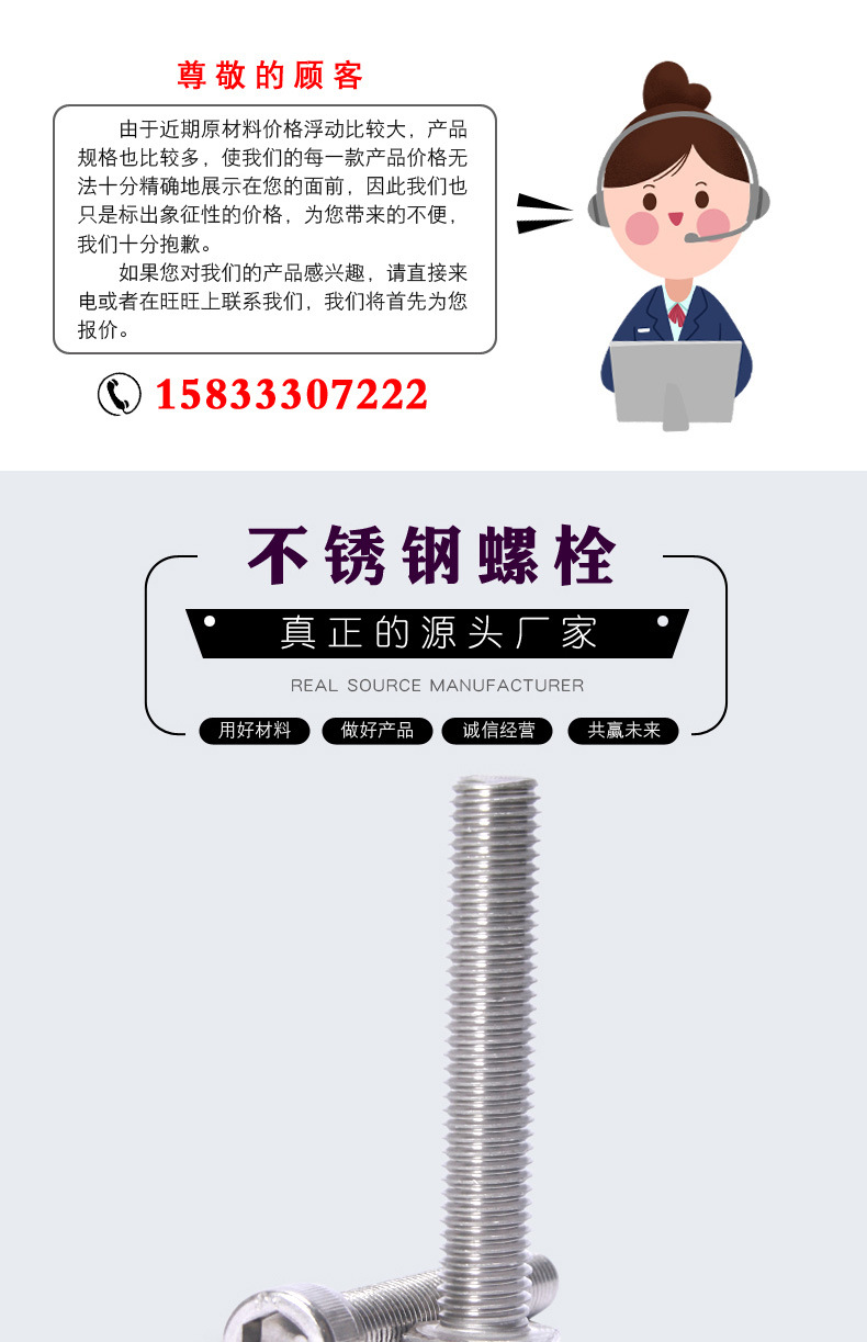 本网页所展示的有关【304不锈钢外六角螺栓m16外六角螺丝 316L材质不锈钢螺栓螺母A4-70_六角螺栓_邯郸市达强紧固件制造有限公司】的信息/图片/参数等由全球零部件网的会员【邯郸市达强紧固件制造有限公司】提供,由全球零部件网会员【邯郸市达强紧固件制造有限公司】自行对信息/图片/参数等的真实性、准确性和合法性负责,本平台(本网站)仅提供展示服务,请谨慎交易,因交易而产生的法律关系及法律纠纷由您自行协商解决,本平台(本网站)对此不承担任何责任。您在本网页可以浏览【304不锈钢外六角螺栓m16外六角螺丝 316L材质不锈钢螺栓螺母A4-70_六角螺栓_邯郸市达强紧固件制造有限公司】有关的信息/图片/价格等及提供【304不锈钢外六角螺栓m16外六角螺丝 316L材质不锈钢螺栓螺母A4-70_六角螺栓_邯郸市达强紧固件制造有限公司】的商家公司简介、江南(中国)等信息。