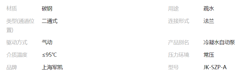 本网页所展示的有关【供应疏水自动加压器,冷凝水自动泵,冷凝水回收器_管材及管接头_上海军凯管件制造有限公司】的信息/图片/参数等由全球零部件网的会员【上海军凯管件制造有限公司】提供,由全球零部件网会员【上海军凯管件制造有限公司】自行对信息/图片/参数等的真实性、准确性和合法性负责,本平台(本网站)仅提供展示服务,请谨慎交易,因交易而产生的法律关系及法律纠纷由您自行协商解决,本平台(本网站)对此不承担任何责任。您在本网页可以浏览【供应疏水自动加压器,冷凝水自动泵,冷凝水回收器_管材及管接头_上海军凯管件制造有限公司】有关的信息/图片/价格等及提供【供应疏水自动加压器,冷凝水自动泵,冷凝水回收器_管材及管接头_上海军凯管件制造有限公司】的商家公司简介、江南(中国)等信息。
