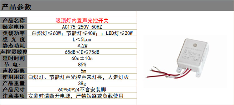 负载功率:负载功率:3-40W节能灯、60W白炽灯、1-20W LDE灯