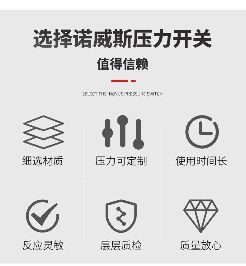 本公司主要生产各类压力开关、温度和流量的控制开关、压力传感器等产品。产品为气动技术、制冷系统、水处理、家用电器、包装系统、液压技术、工业自动化等各个领域,提供优良的压力控制设备。