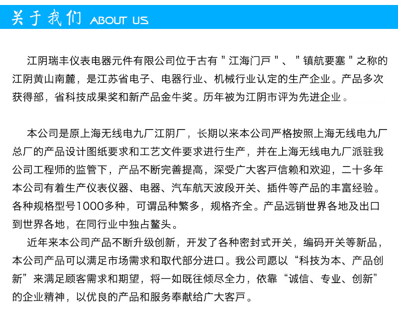 该波段开关由江阴瑞丰仪表电器元件有限公司(原上无九厂江阴分厂)生产,质量保障,价格优惠。