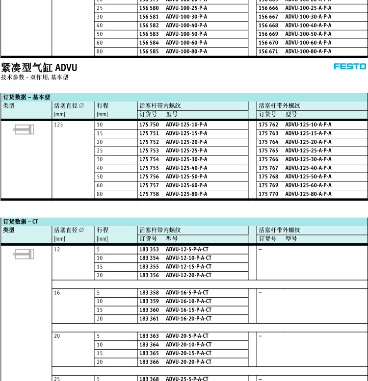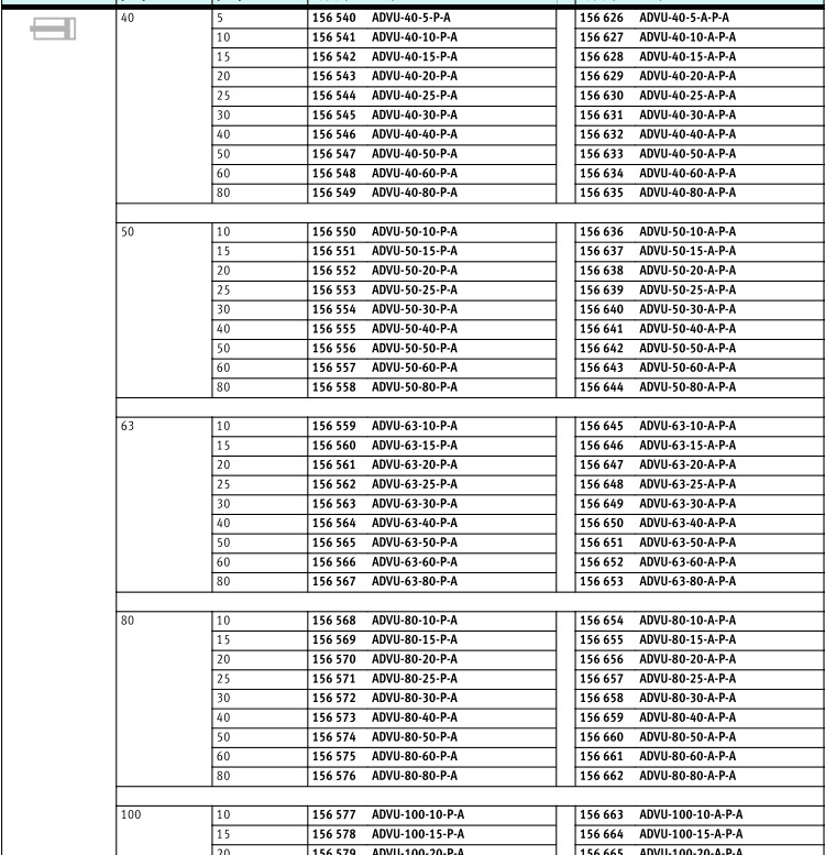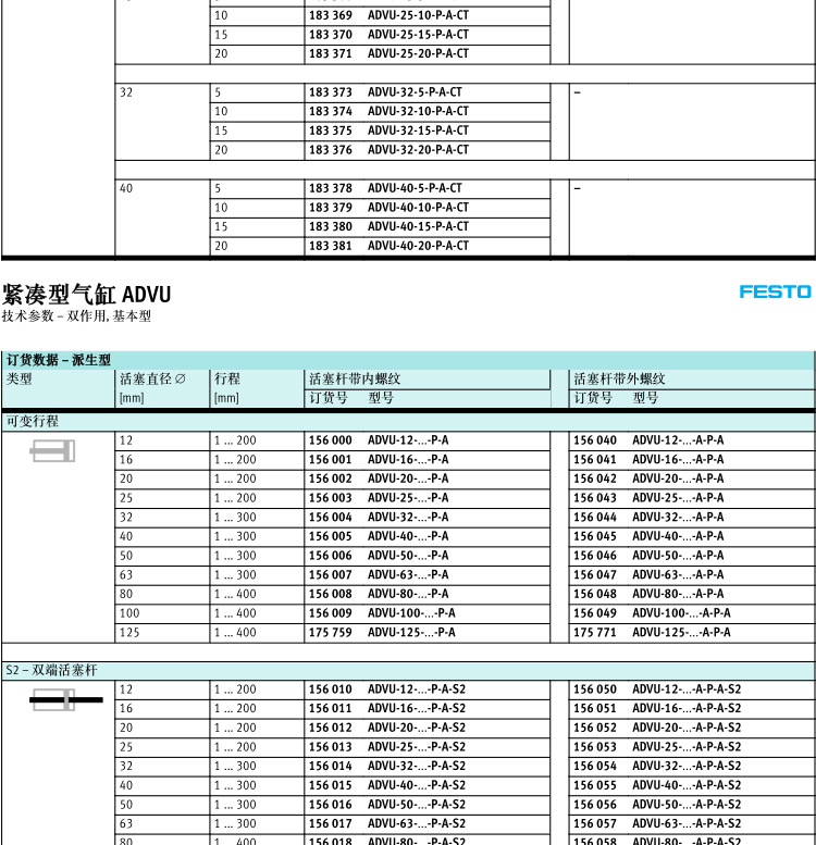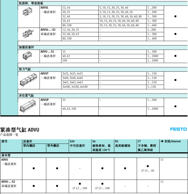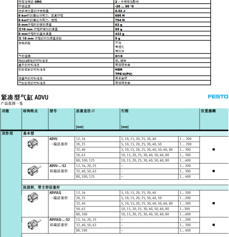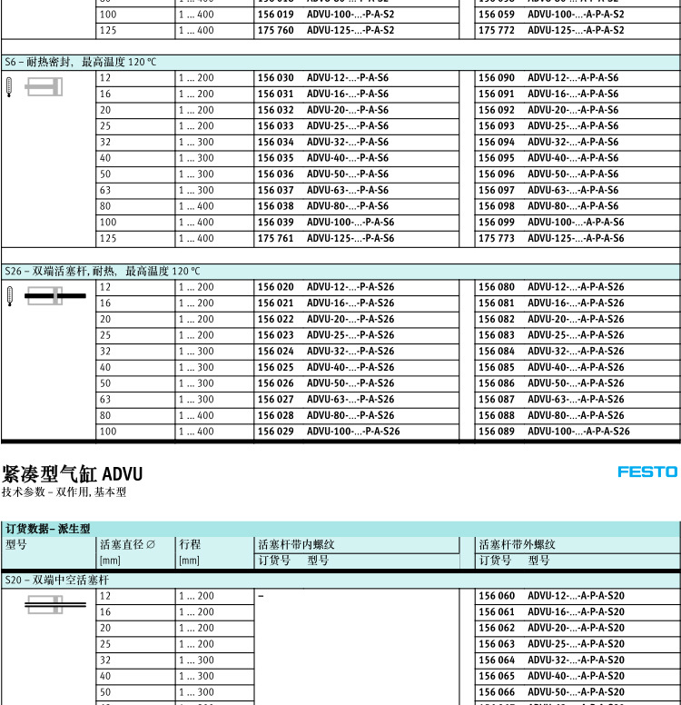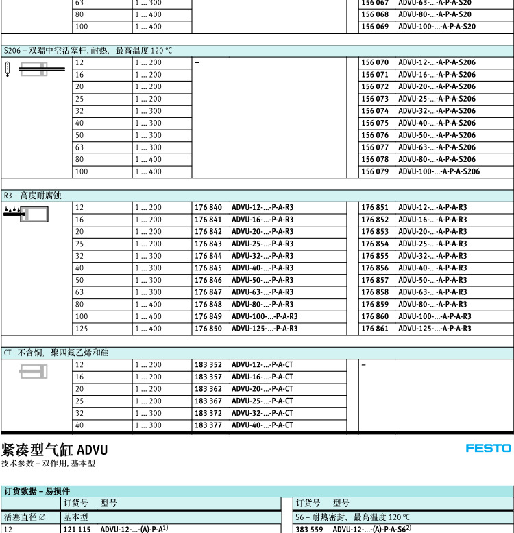选型代码:型号(ADVU/ADVULQ)+缸径(12,16,20,25,32,40,50,63,80,100,125)+行程(1 ...400),+活塞杆螺纹(内螺纹,A外螺纹)+P 缓冲(两端带弹性缓冲垫)+A 带位置感测派生型代码:S1加强型活塞杆,S2双端活塞杆,S6耐高温,高120度,S20双端中空活塞杆,耐高温,高120度,S206双端中空活塞杆,耐高温,高120度,R3增强耐腐蚀等级。