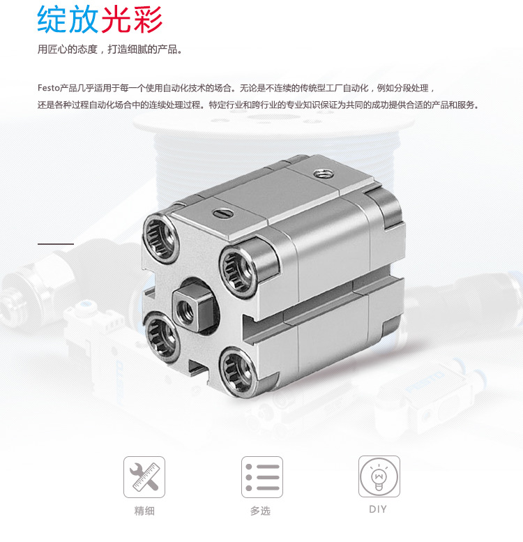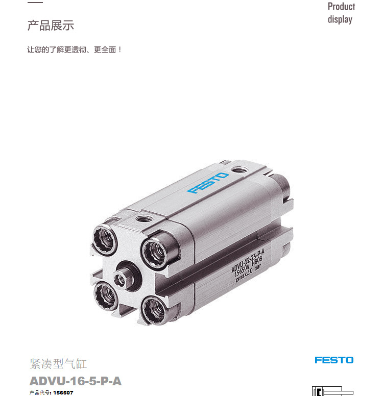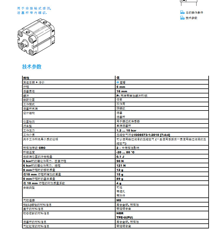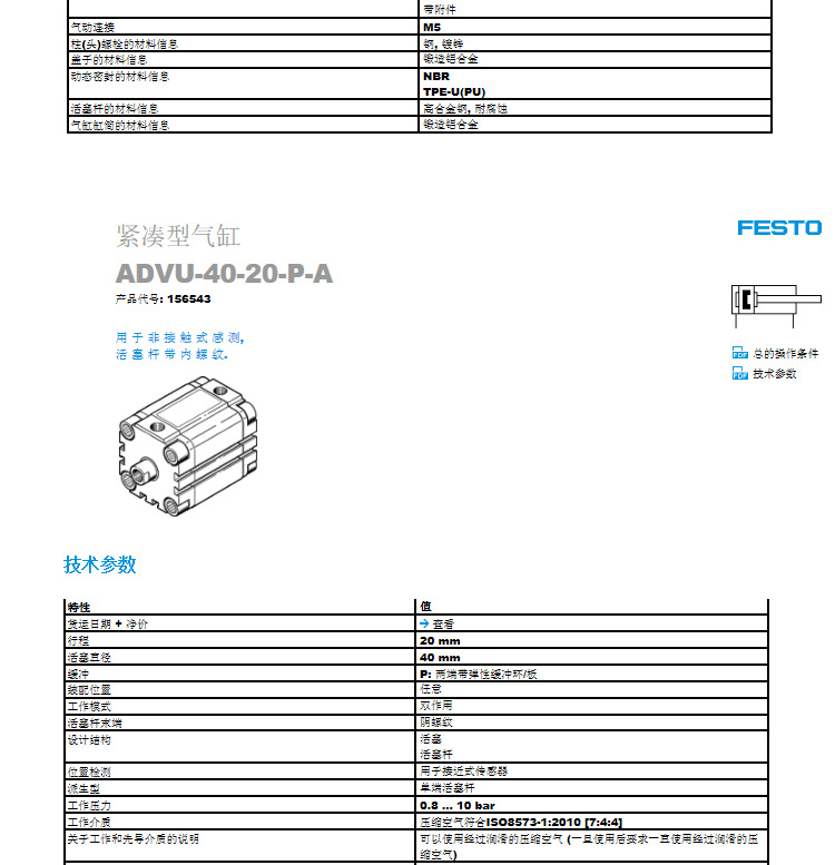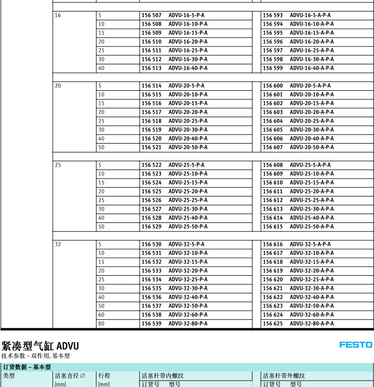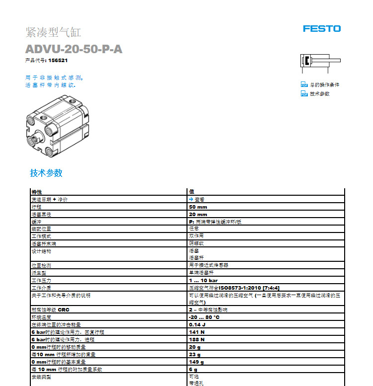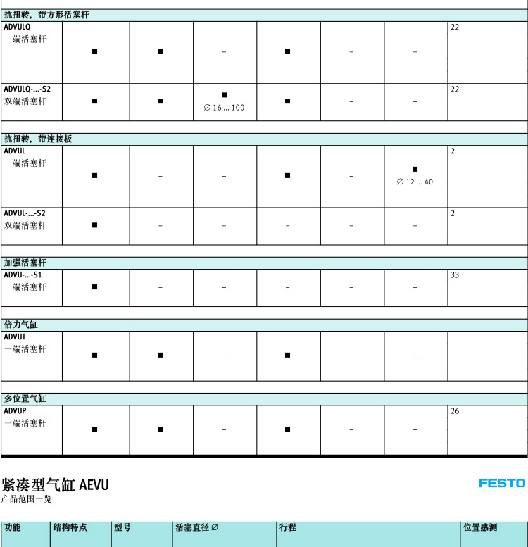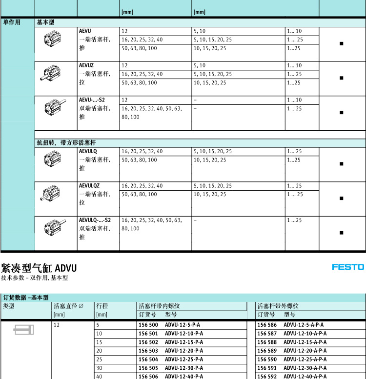 选型代码:型号(ADVU/ADVULQ)+缸径(12,16,20,25,32,40,50,63,80,100,125)+行程(1 ...400),+活塞杆螺纹(内螺纹,A外螺纹)+P 缓冲(两端带弹性缓冲垫)+A 带位置感测派生型代码:S1加强型活塞杆,S2双端活塞杆,S6耐高温,高120度,S20双端中空活塞杆,耐高温,高120度,S206双端中空活塞杆,耐高温,高120度,R3增强耐腐蚀等级。