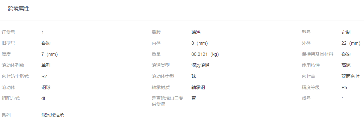 本网页所展示的有关【厂家直供微型深沟球轴承608轴承 用溜冰鞋及精密仪器 8*22*7MM_深沟球轴承_河北瑞鸿轴承制造有限公司】的信息/图片/参数等由全球零部件网的会员【河北瑞鸿轴承制造有限公司】提供,由全球零部件网会员【河北瑞鸿轴承制造有限公司】自行对信息/图片/参数等的真实性、准确性和合法性负责,本平台(本网站)仅提供展示服务,请谨慎交易,因交易而产生的法律关系及法律纠纷由您自行协商解决,本平台(本网站)对此不承担任何责任。您在本网页可以浏览【厂家直供微型深沟球轴承608轴承 用溜冰鞋及精密仪器 8*22*7MM_深沟球轴承_河北瑞鸿轴承制造有限公司】有关的信息/图片/价格等及提供【厂家直供微型深沟球轴承608轴承 用溜冰鞋及精密仪器 8*22*7MM_深沟球轴承_河北瑞鸿轴承制造有限公司】的商家公司简介、江南(中国)等信息。