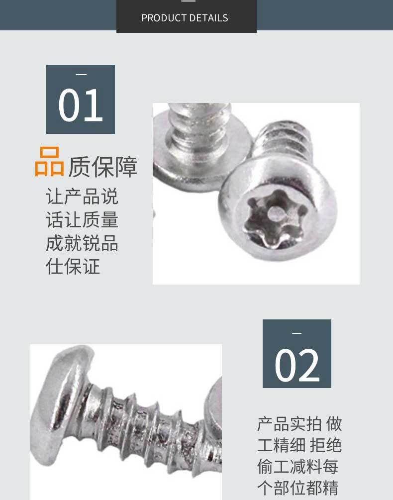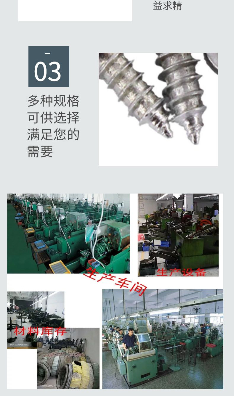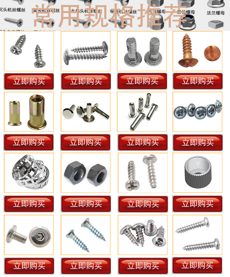 五金螺丝、PA自攻螺丝、PWA带垫自攻螺丝、台阶螺丝、杯头内六角螺丝、沉头内六角、圆头内六角、外 六角螺丝、沉头机丝 、圆头机丝、带垫机丝、沉头自攻铆钉、半空心铆钉、实心铆钉、内六角螺丝、 杯头内六角、三组合、圆头三组合、外六角三组合,膨胀螺丝、手拧螺丝、牙条丝杆、紧定螺丝、六角 螺母、法兰螺母、防松螺母、盖型螺母、法兰防松螺母、四方螺母、圆头割尾自攻螺丝、焊接螺母、蝴 蝶螺母、圆柱销、平垫、弹垫、防盗螺丝、实心铆钉、半空心铆钉、CNC铆钉、台阶铆钉等。规格有M1.2 、1.5、1.7、2、3、4、5、6、7、8、9、10、11,长度2、3、4、5、6、7、8、9、10、11、12、13、14 、15、16、17、18、19、20-
